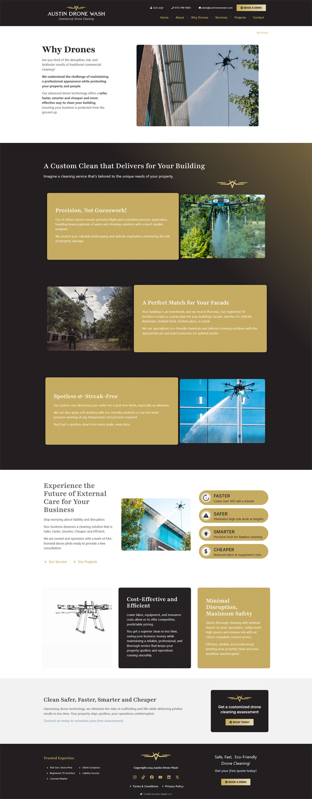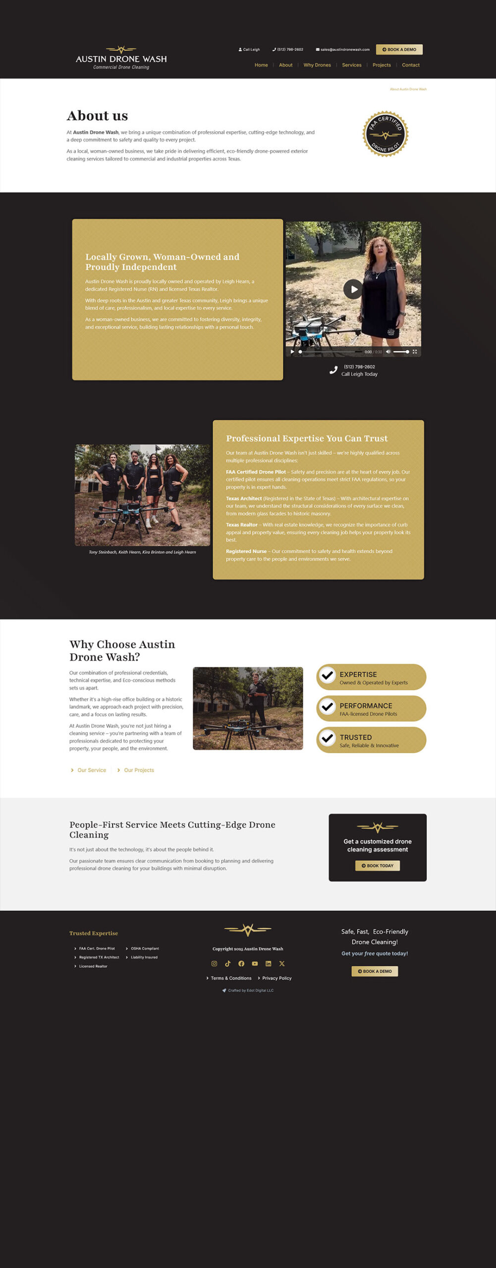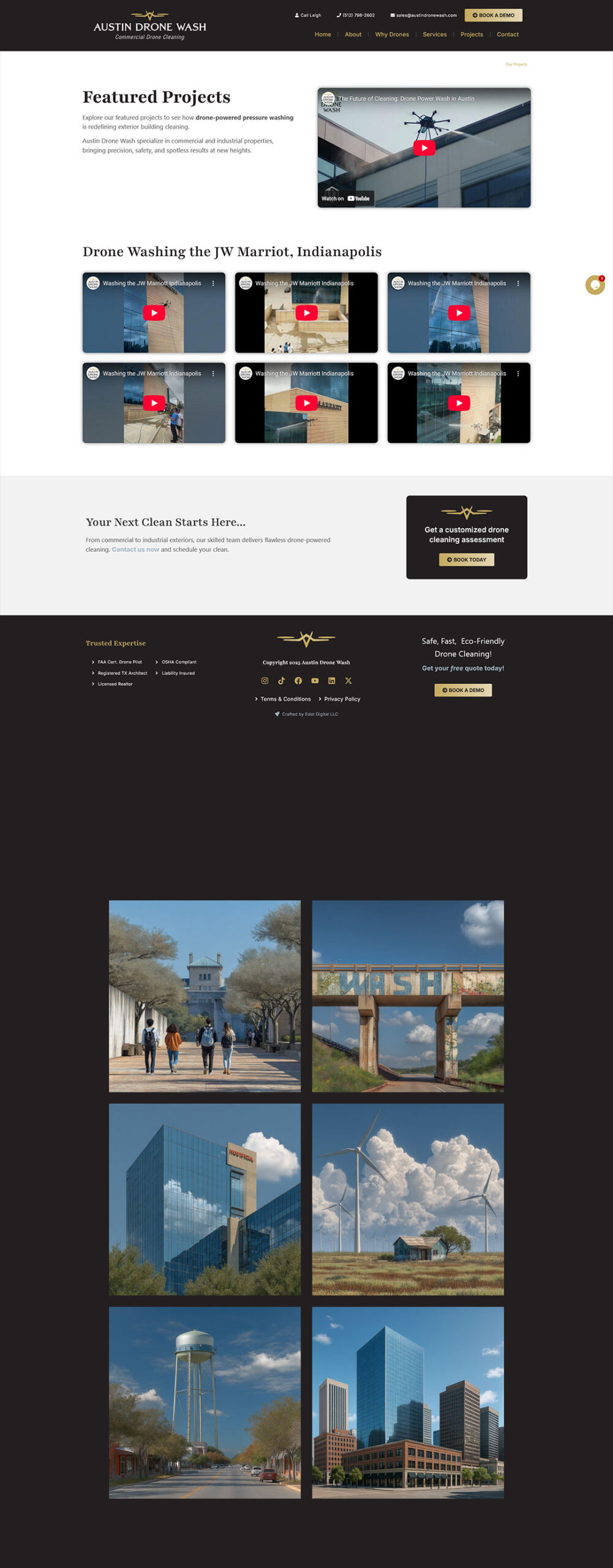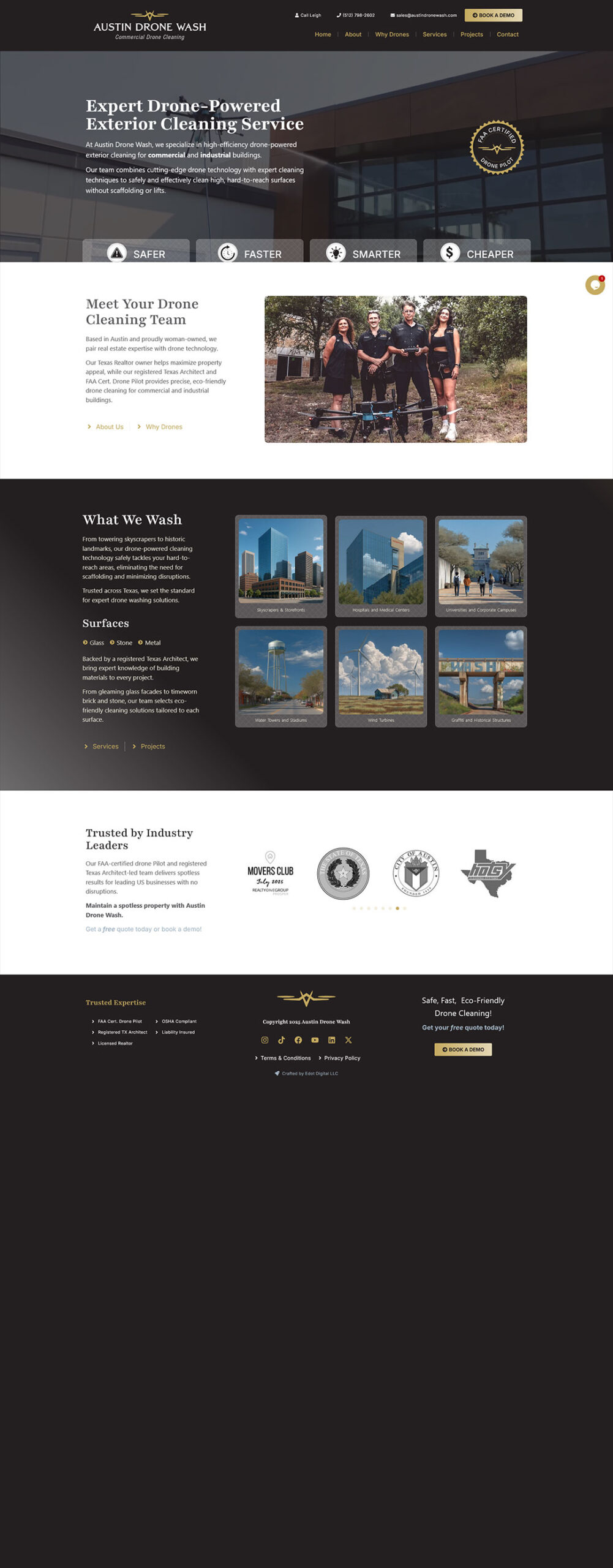 The new Austin Drone Wash website successfully combines modern design, strategic SEO, and engaging video content to create a high-performing digital presence.