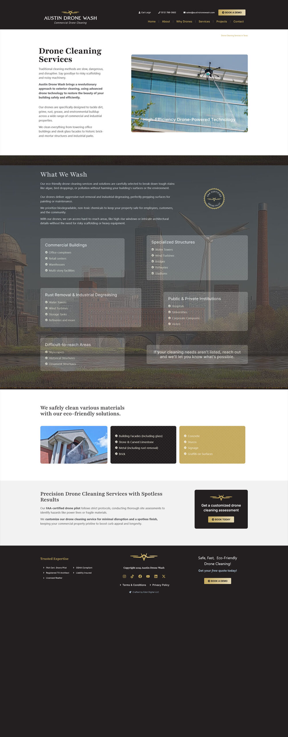 Austin Drone Wash is a pioneering exterior cleaning company in Austin, Texas, utilizing cutting-edge drone technology to deliver safer, faster, and more cost-effective building cleaning solutions. Their target audience includes commercial property managers, construction firms, and industrial clients across Texas.